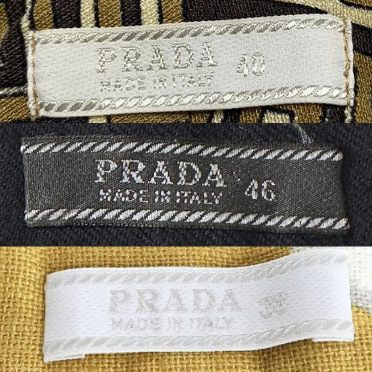 Three authentic labels from this period are showcased. The label featured the Prada text, along with details of the country of manufacture and the item's size.