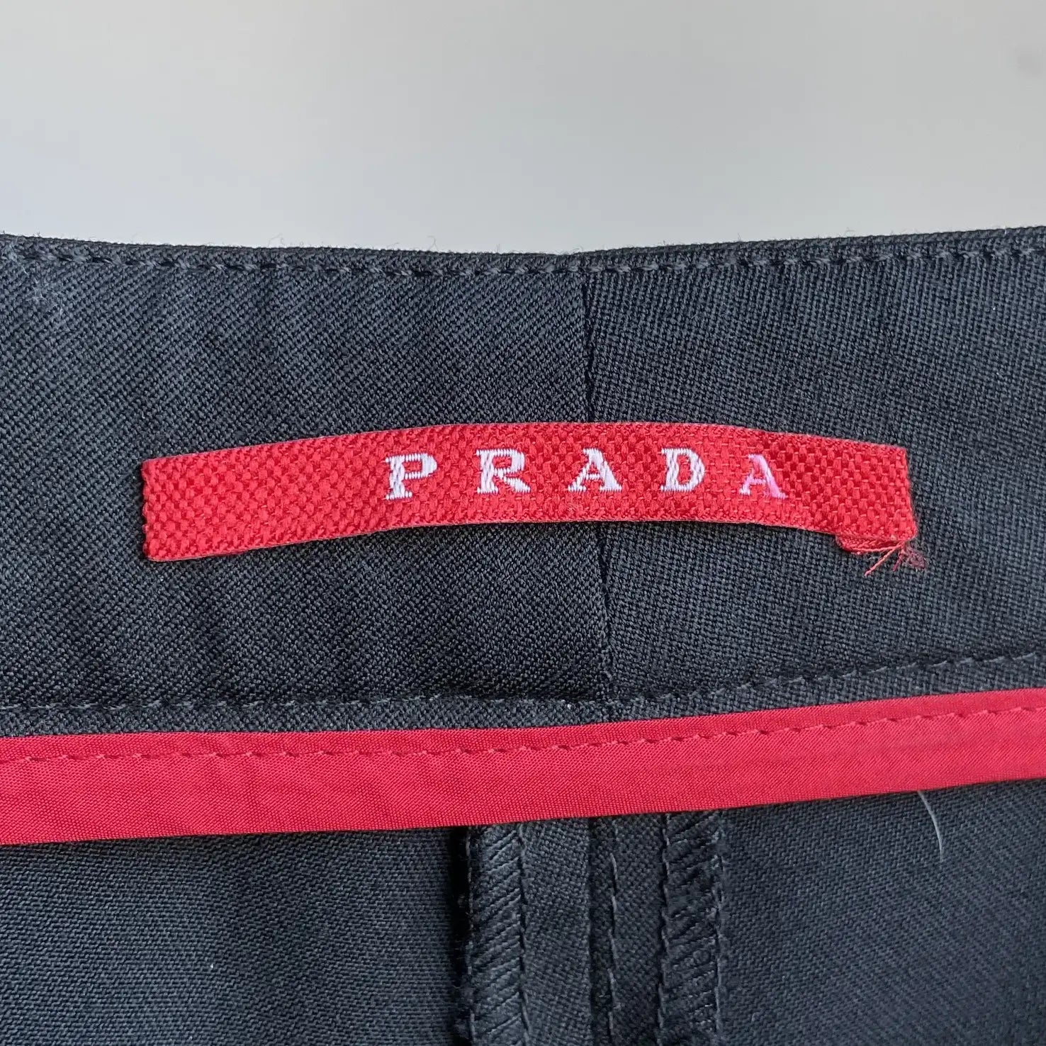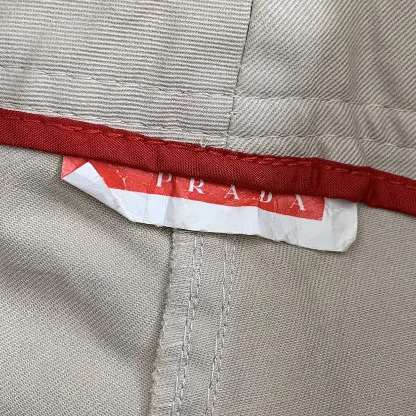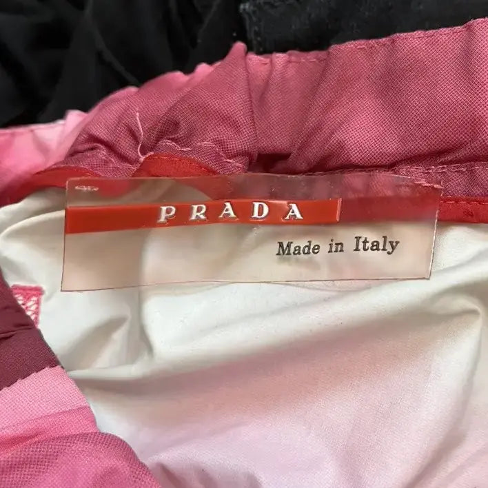 An authentic label from this period is showcased. This label was red in colour with white Prada text.