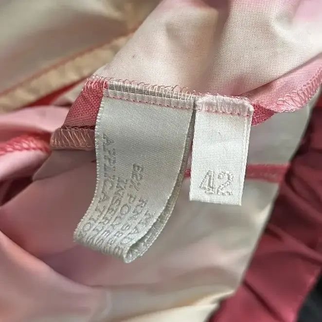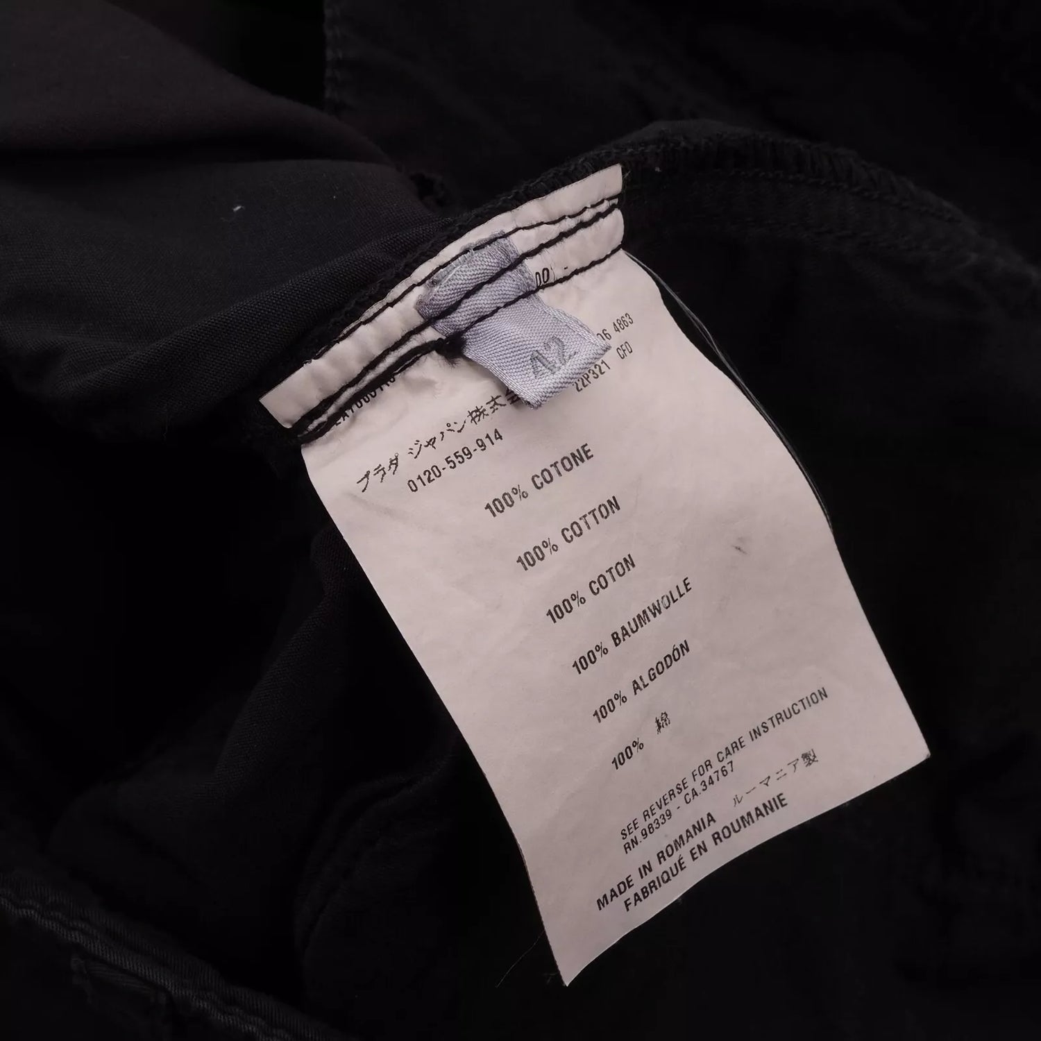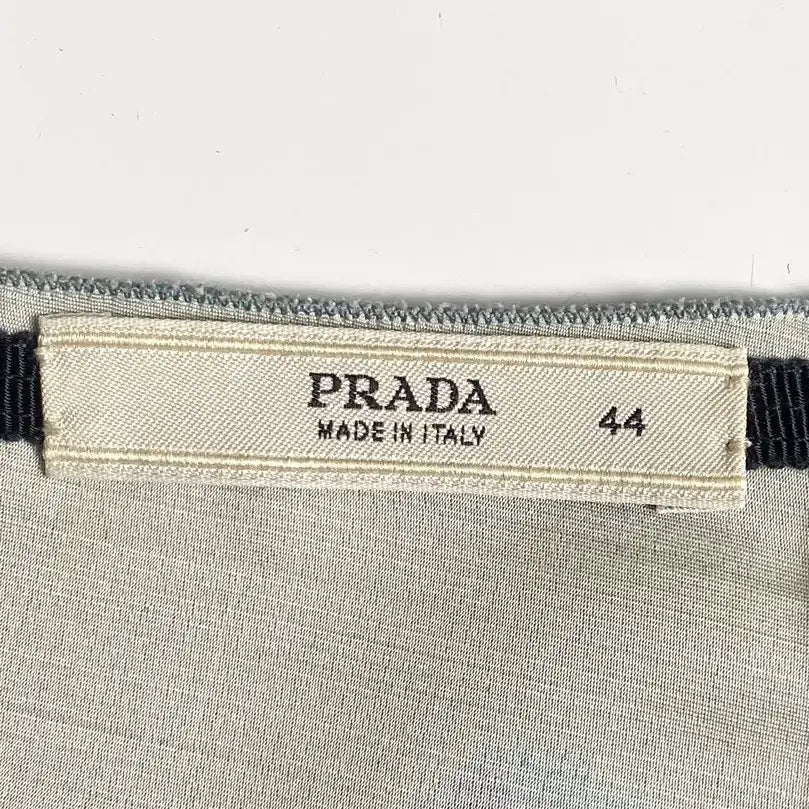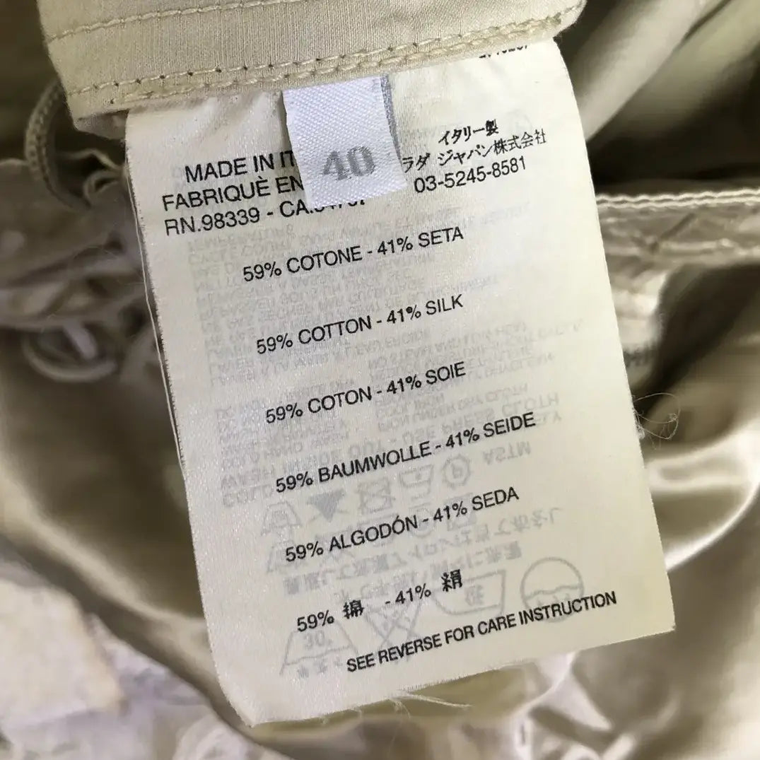 An authentic label from this period is showcased. This label was cream-coloured with black text. A separate variation of this label also existed, featuring the same style but with a larger Prada text and without the country of manufacture or size details.