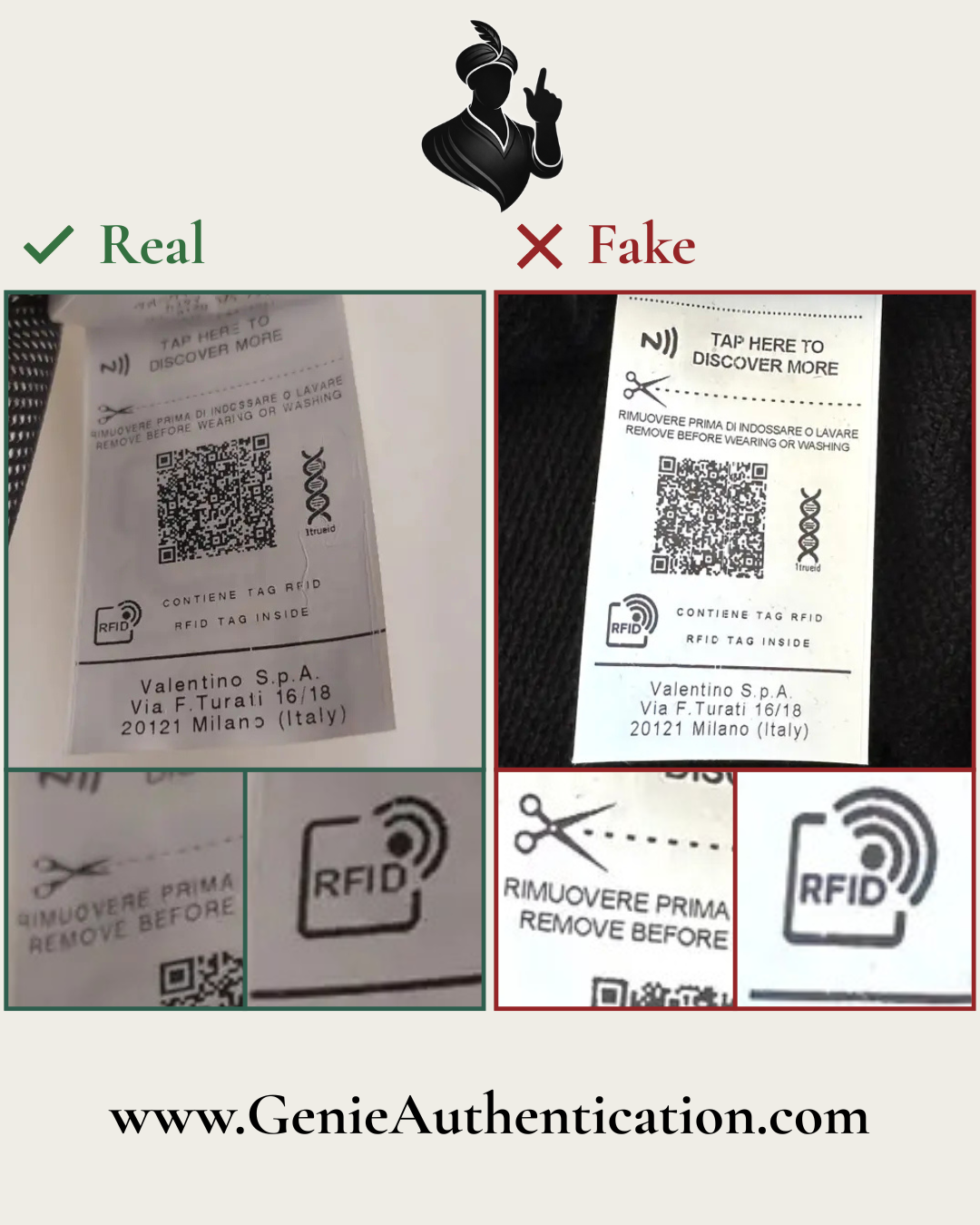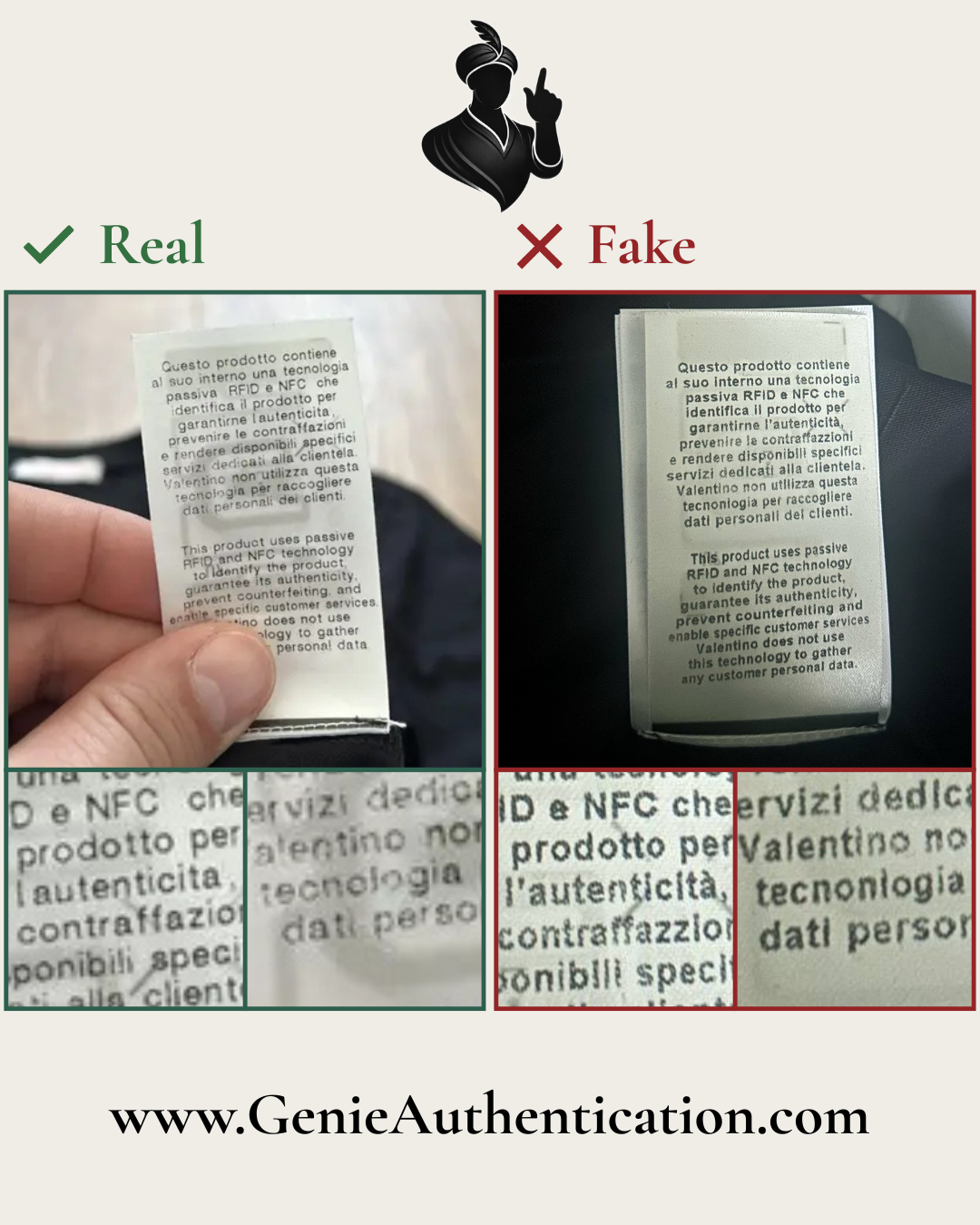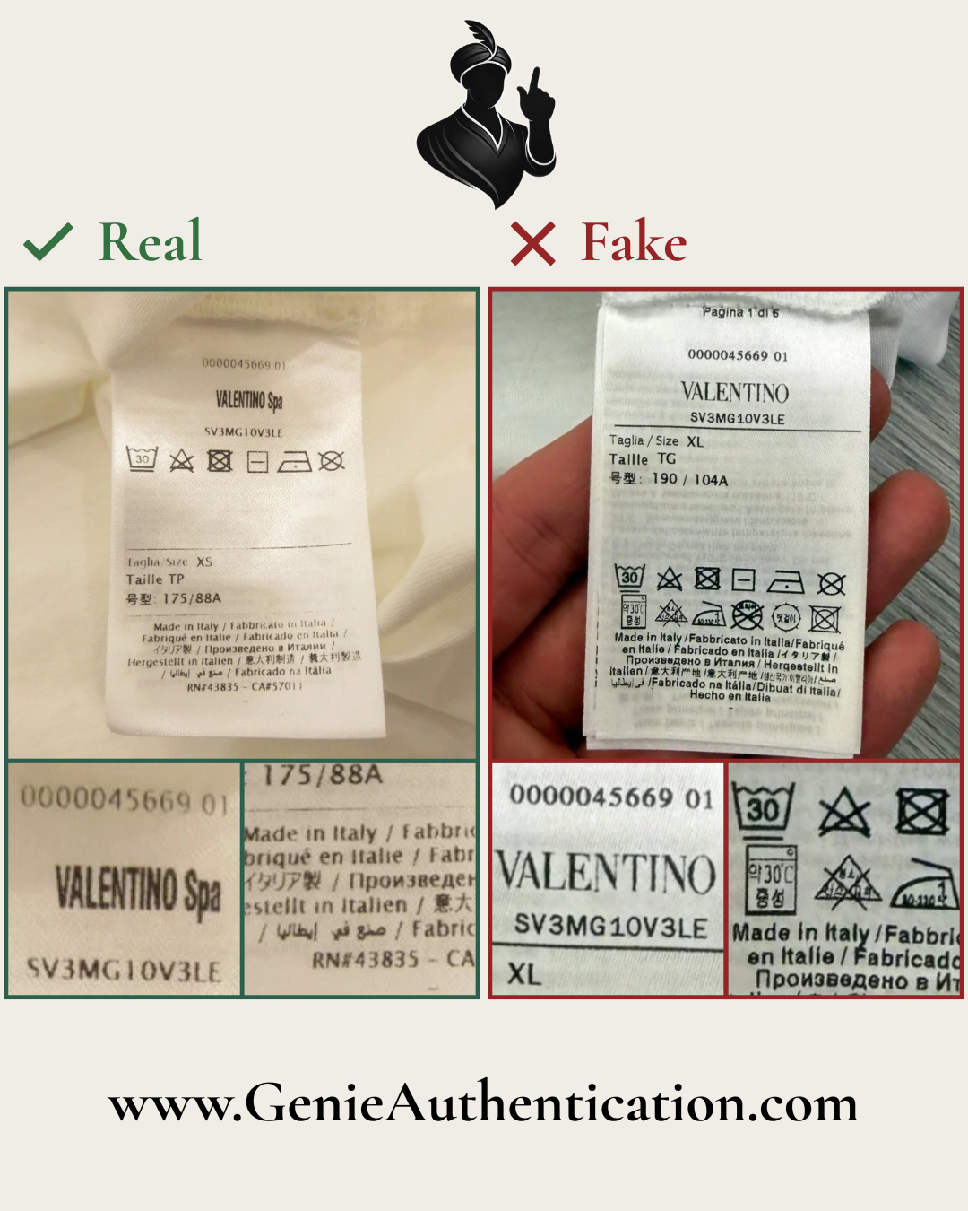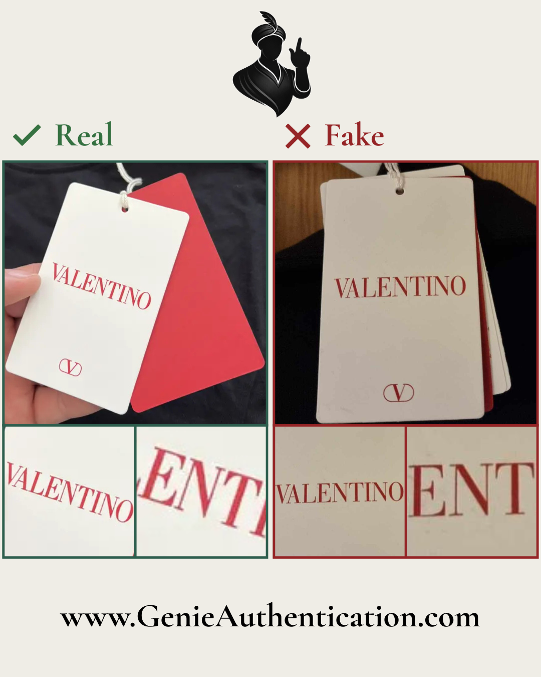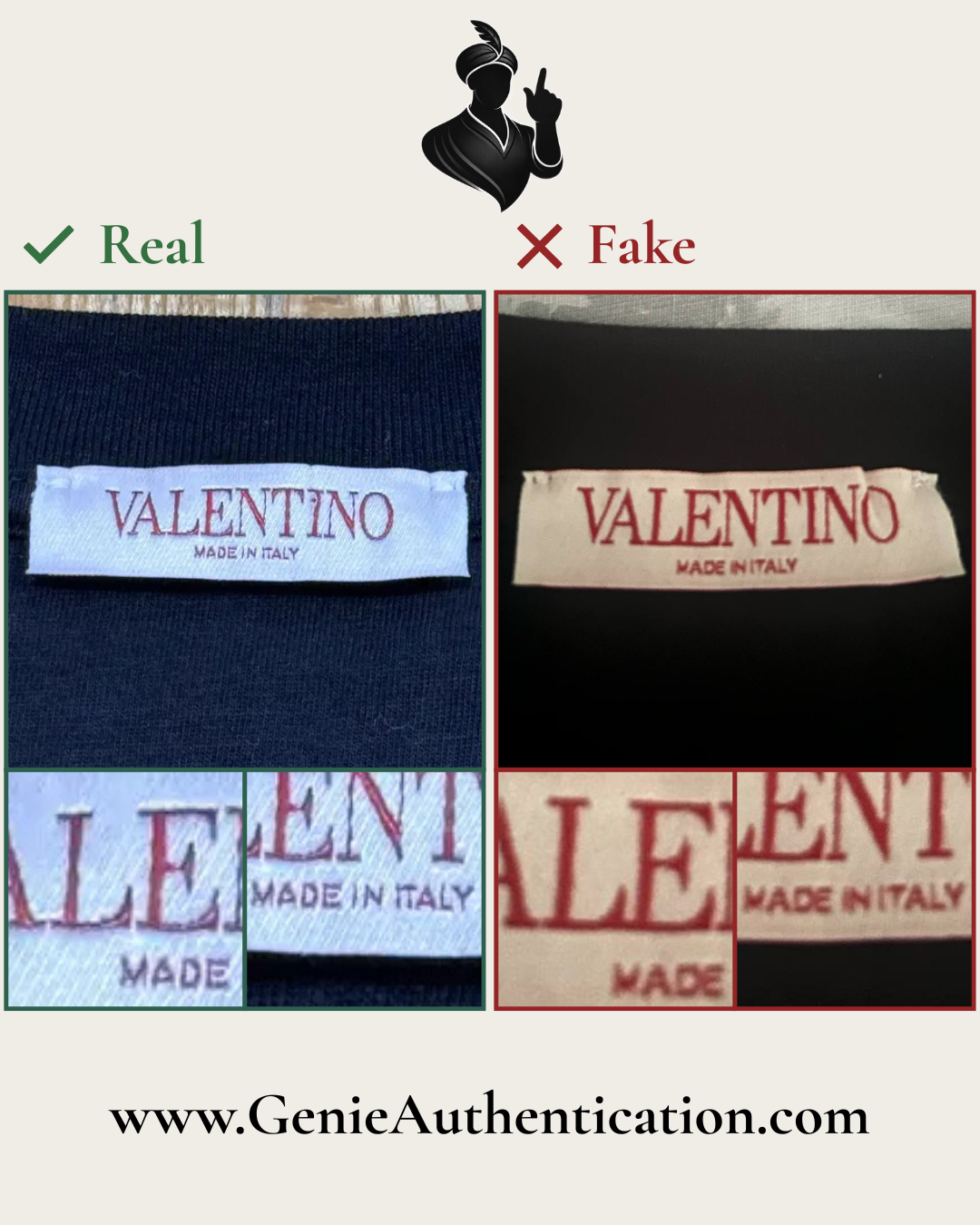 In this example, the counterfeit text is poorly replicated, most notably in the shapes of the letterforms 'L', 'E', 'T', and 'I' in 'VALENTINO'.